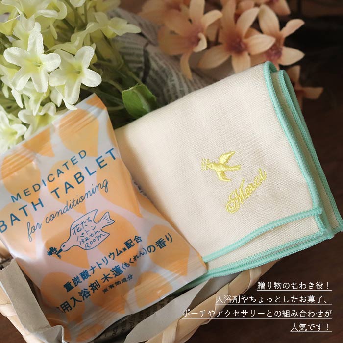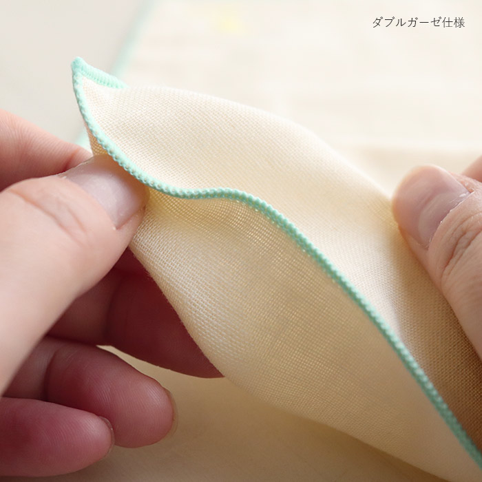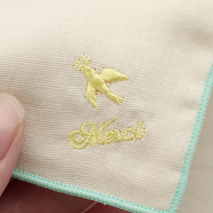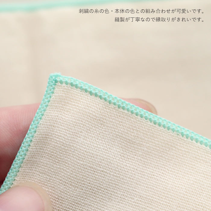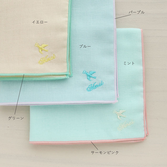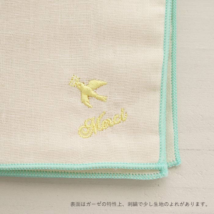 Soldout ハンカチ ダブルガーゼハンカチ 小鳥刺繍柄 ミントxサーモンピンク 綿100% 日本製