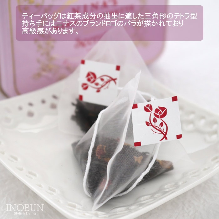• ティーバッグは、紅茶成分の抽出に適したテトラ型。持ち手にはニナスのブランドロゴのバラが描かれており高級感があります。