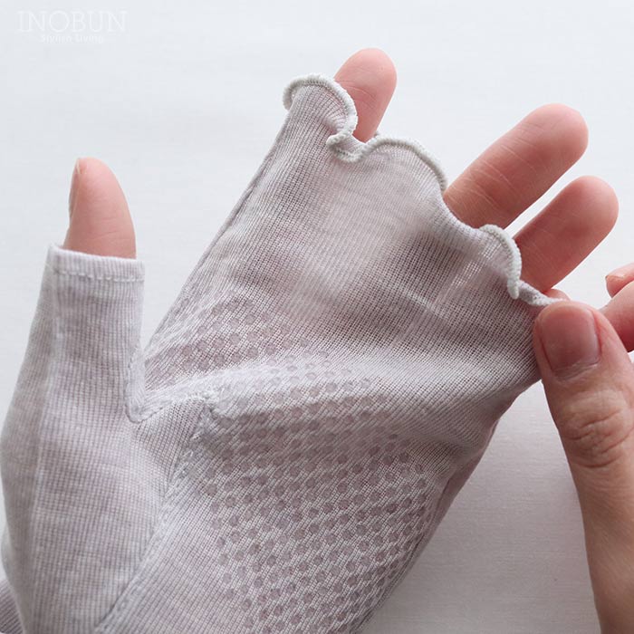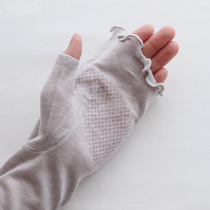 • 指先はメローフリルで、シンプルな中にさりげない可愛さを。生地は薄手で柔らかく、掌まわりはややゆとりのあるデザインです。